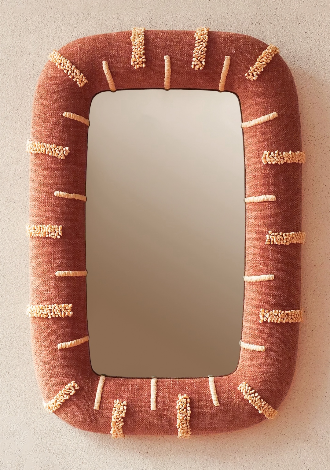 ART MIRROR WITH HAND-EMBROIDERED RAFFIA RIBBONS